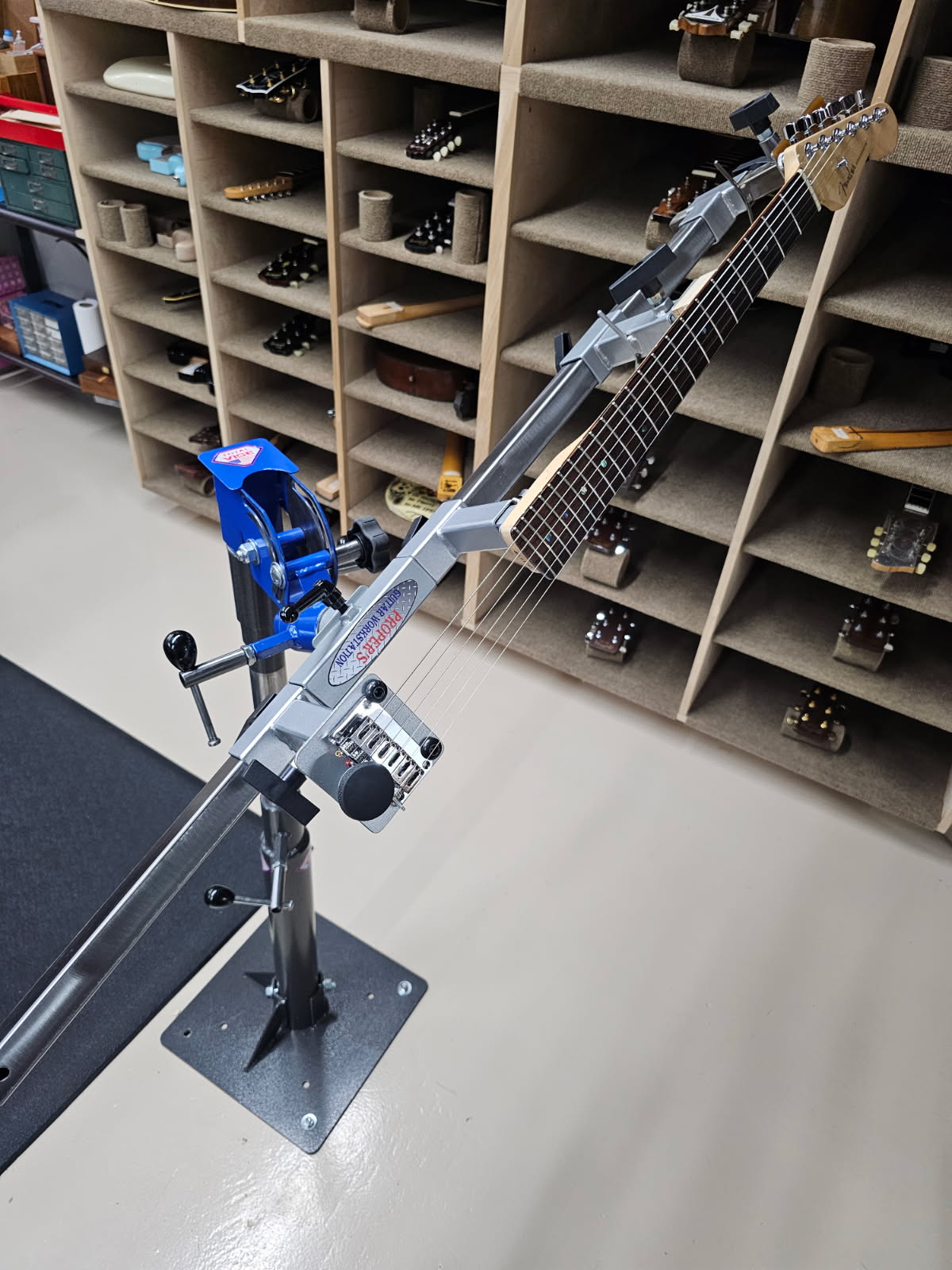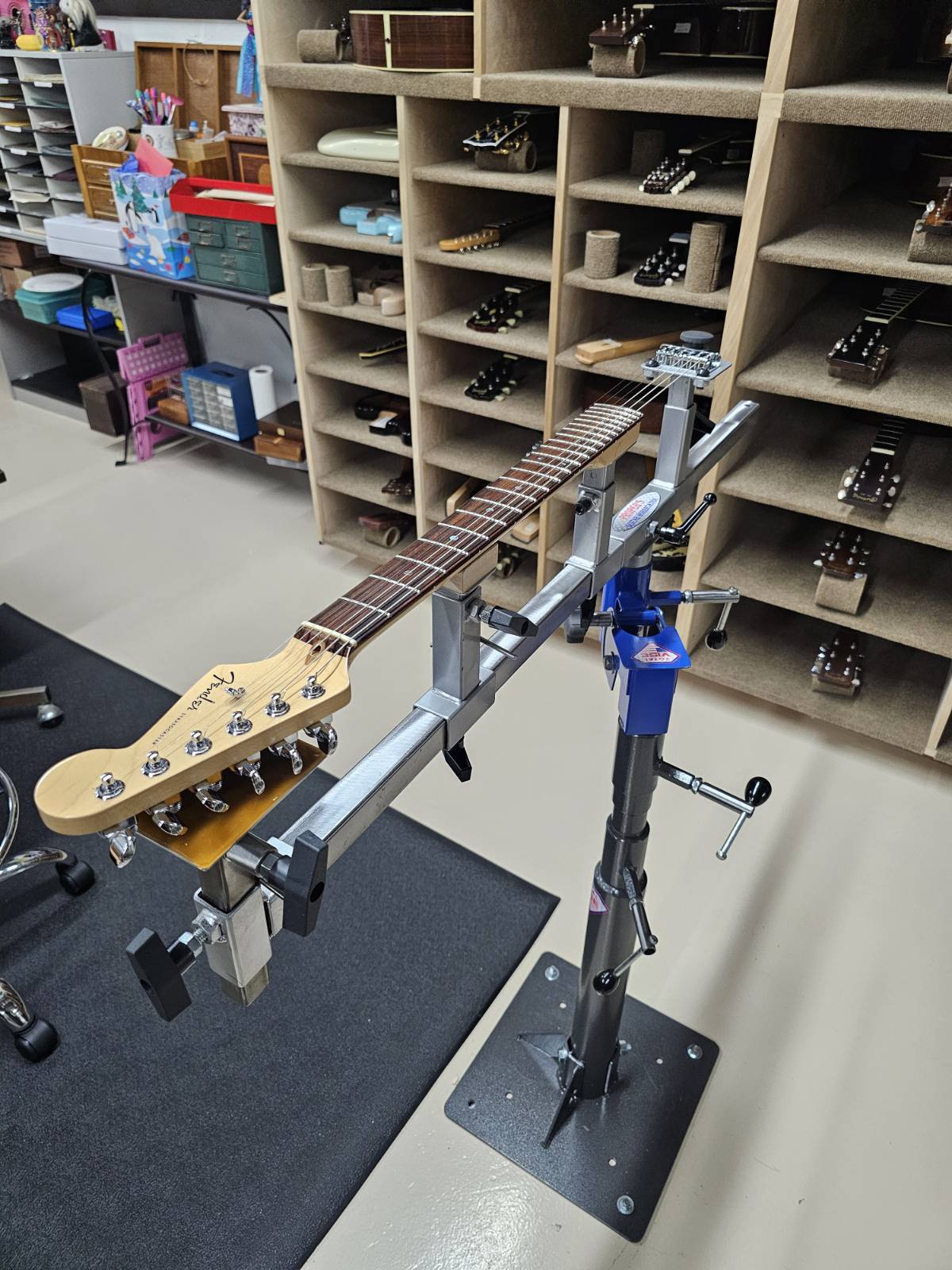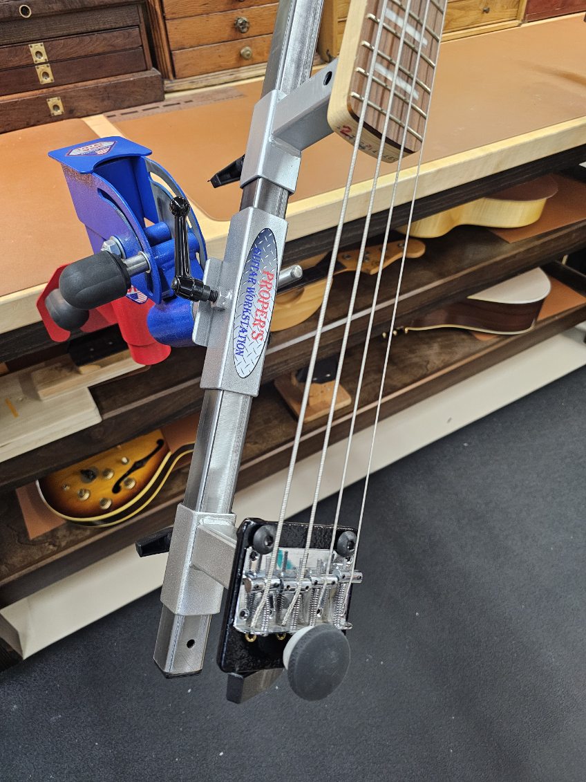 The new Erlewine Bodyless Neck Support for the Proper’s Guitar Workstation is a two-piece accessory that allows you to bolt a fender-style bolt on neck to the workstation for fretwork or setup work in conjunction with a surrogate universal bridge attachment to which you can attach any flush-mount guitar or bass bridge.