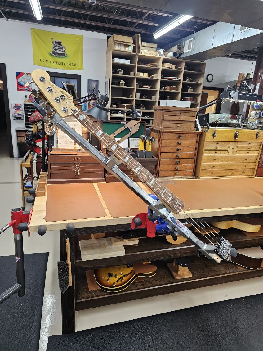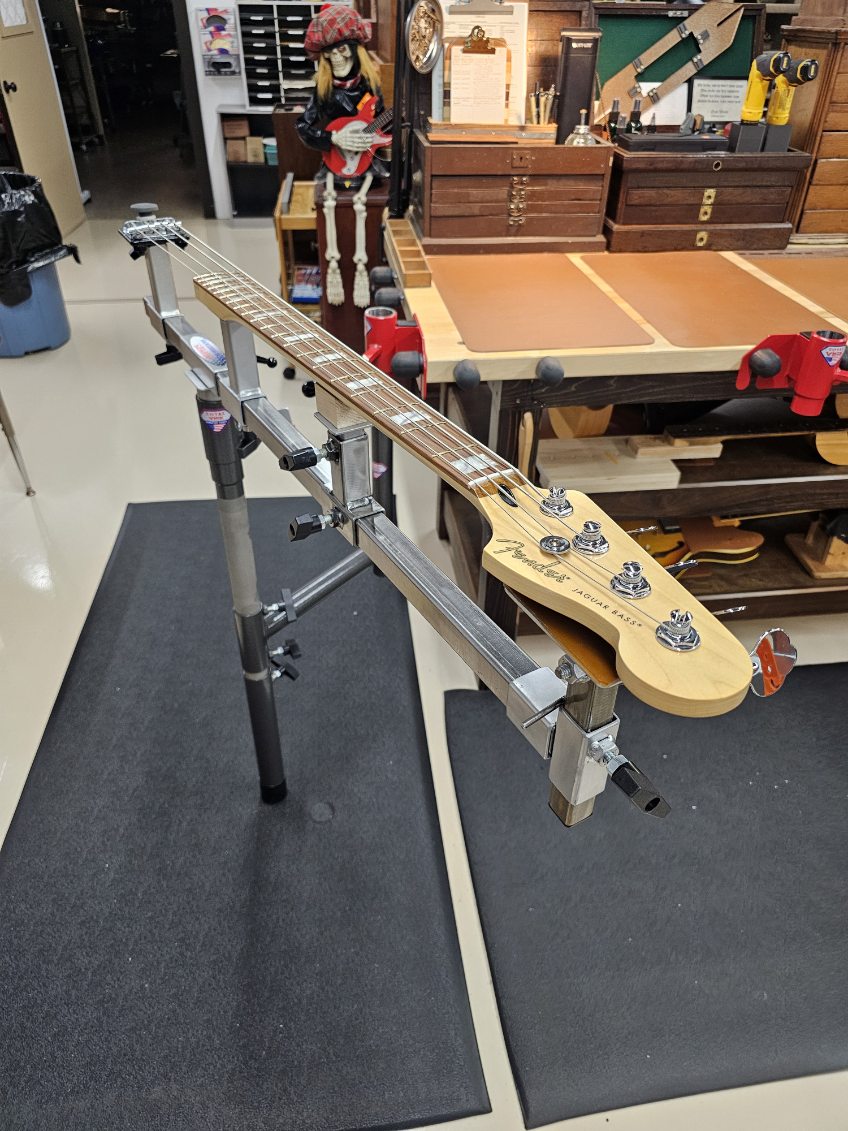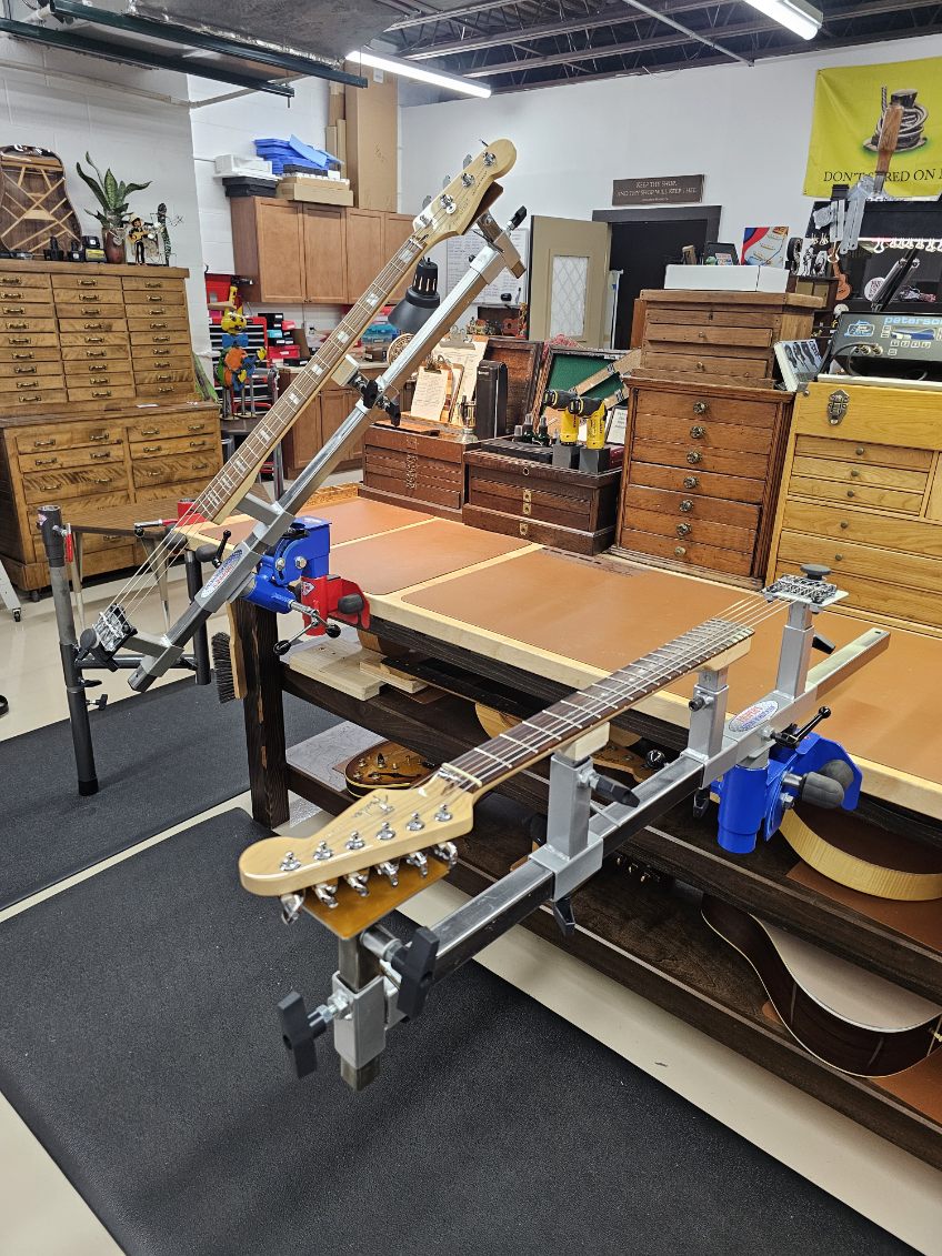 The new Erlewine Bodyless Neck Support for the Proper’s Guitar Workstation is a two-piece accessory that allows you to bolt a fender-style bolt on neck to the workstation for fretwork or setup work in conjunction with a surrogate universal bridge attachment to which you can attach any flush-mount guitar or bass bridge.